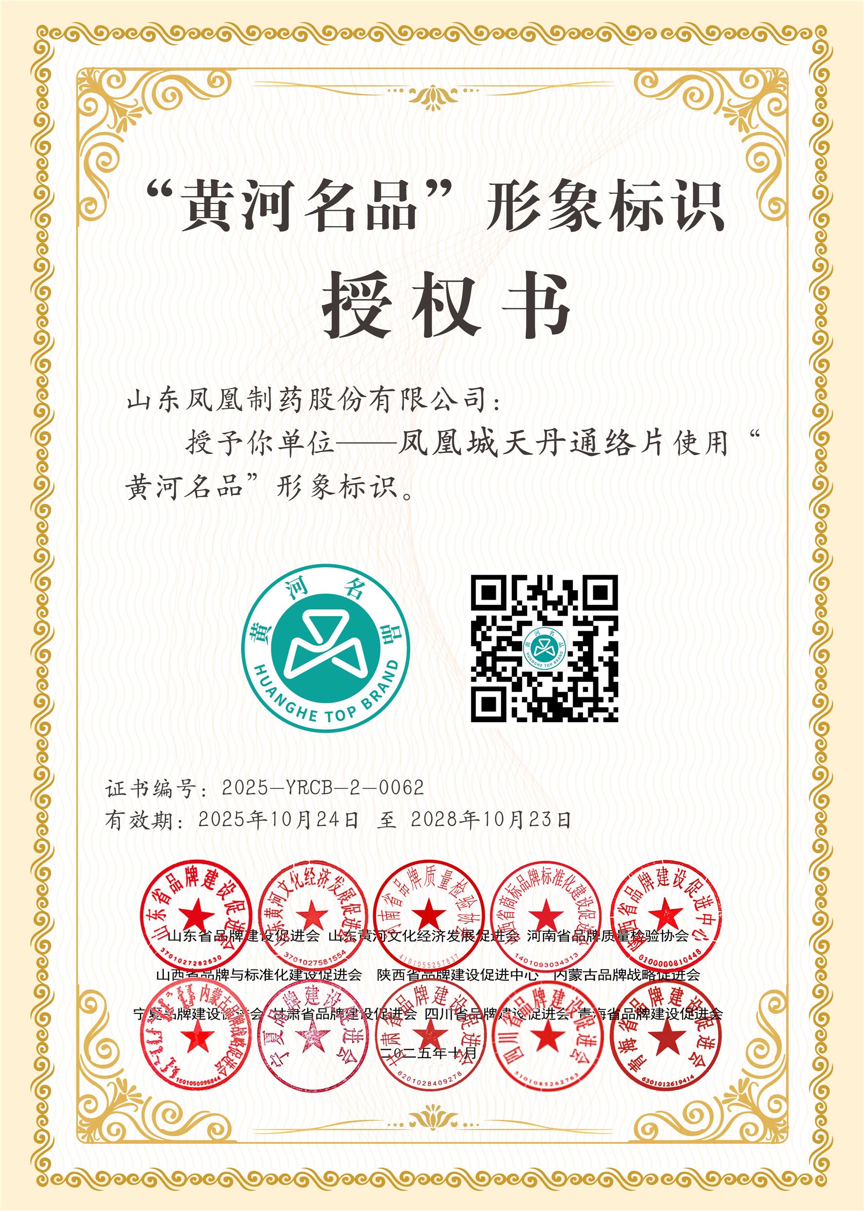 10月24日,由中国黄河文化经济发展研究会指导,山东省品牌建设促进会主办,河南省品牌质量检验协会、山西省商标品牌标准化建设促进会、陕西省品牌建设促进中心、内蒙古品牌战略促进会、宁夏品牌建设促进会、甘肃省品牌建设促进会、四川省品牌建设促进会、青海省品牌建设促进会联合主办的“2025黄河品牌大会”在济南召开,大会上沿黄九省(区)品牌建设联席会正式公布了2025年度“黄河名品”公共品牌遴选结果,凤凰制药等101家申报主体入选。凤凰制药公司天丹通络片荣获2025年度“黄河名品”产品品牌,这一荣誉标志着公司在产品质量、市场竞争力和社会美誉度方面获得了沿黄流域品牌建设领域的权威认可。